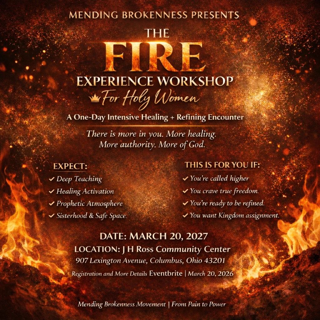 The Mending Brokenness Fire Experience Workshop is a sacred, life-changing encounter created for women who are ready to move beyond brokenness and step into healing, refinement, and spiritual renewal.